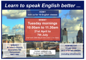 ESL spring term starts on 21st April 2026, as follows: every Tuesday 21st April to 7th July (Half term 26th May & 2nd June – no class)